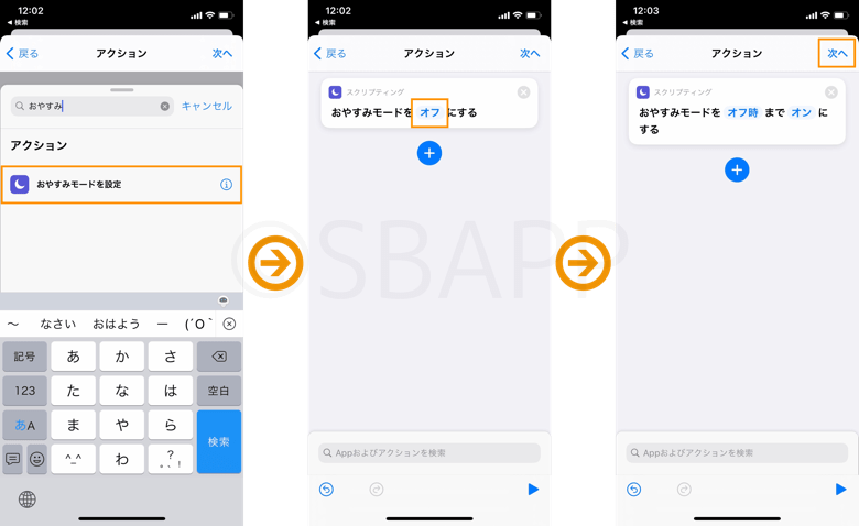 - アクション画面で「おやすみモードをオフにする」のオフをタップし、「おやすみモードをオフ時までオンにする」に変更