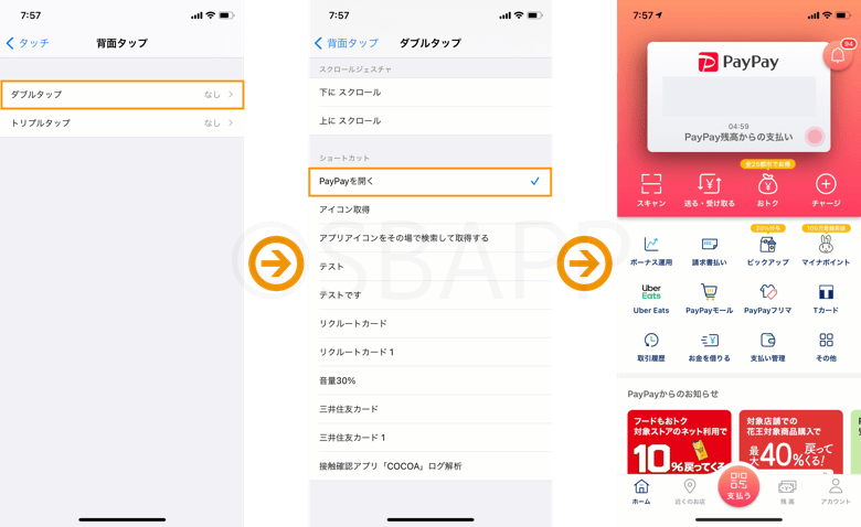 背面タップにはスクリーンショットやSiriといった機能も割り当てられますが、普段から電子決済を利用している場合は「電子決済アプリを起動するショートカット」を割り当てることで支払い時の操作が楽になります。