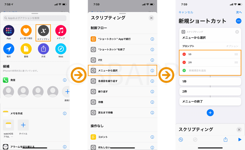 - 新規ショートカット画面に追加された、スクリプティング内の選択をタップ