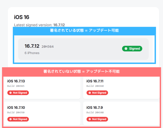最近ではiOS12.5.8、iOS15.8.6、iOS16.7.13、iOS18.7.4が配信当日に署名が停止されてしまい、各所でエラー報告が相次いだこともあるため、まずは署名が発行されているか確認することをお勧めします。