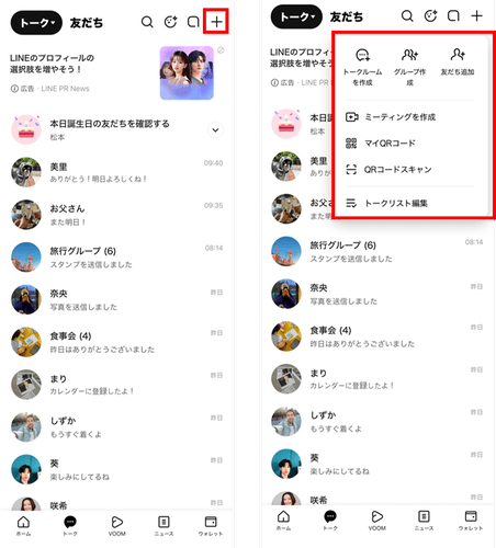 - 画面右上の「+」ボタンに、トーク作成や友だち追加、QRコードなどの機能を集約