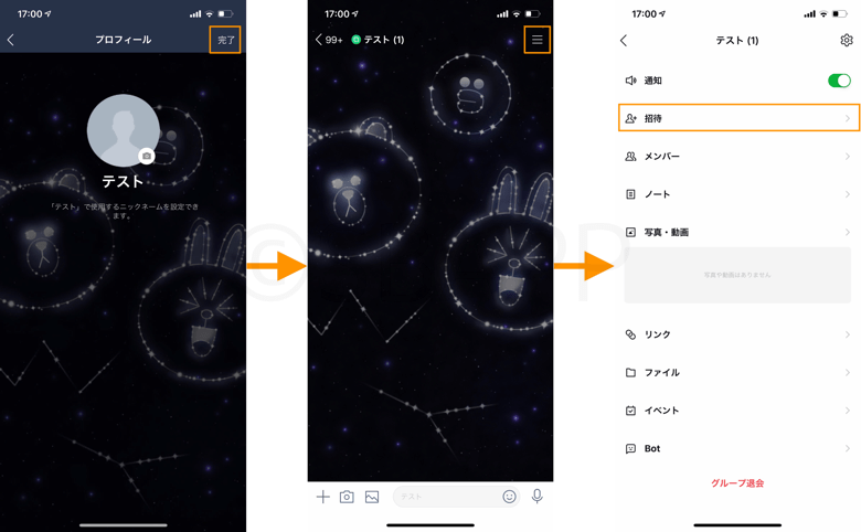 - 画面右上のメニュー→招待から友だちをグループに招待することができます