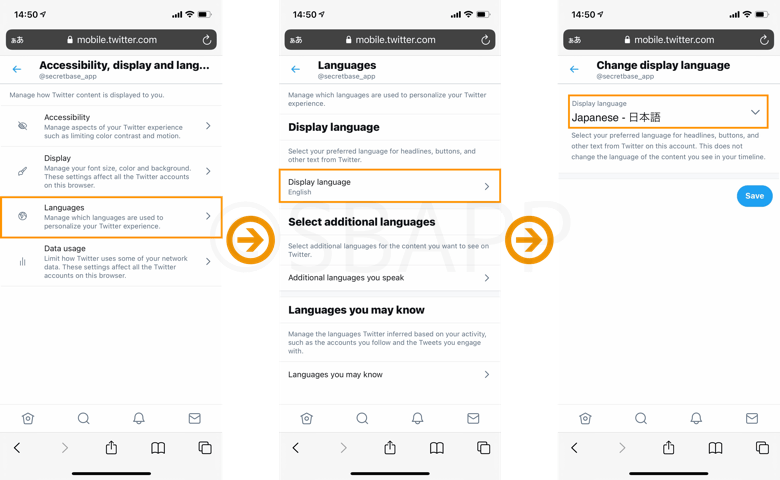もしiOS版Twitterアプリ、モバイル版Twitterが英語表示になった場合、次の手順で日本語表示に戻すことができます。