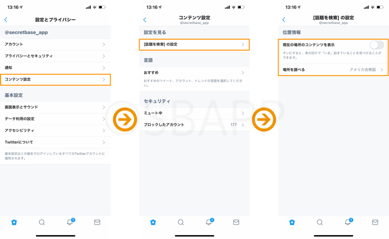 iOS版Twitterアプリでは、以下の手順でコンテンツ設定を開きトレンドの場所(国)を変更することで、日本で話題のトレンドを非表示にできます。